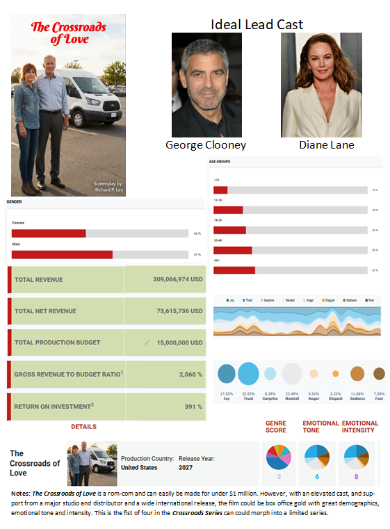 The Crossroads of Love is the first of the Crossroads Series bo be turned into a screenplay. However, the other three stories are interconnected and carry on the dual stories of Charlie and Erin along with Flynn and Claire. These could represent four terrific feature films, or morph into a limited series spanning several years of quality entertainment.